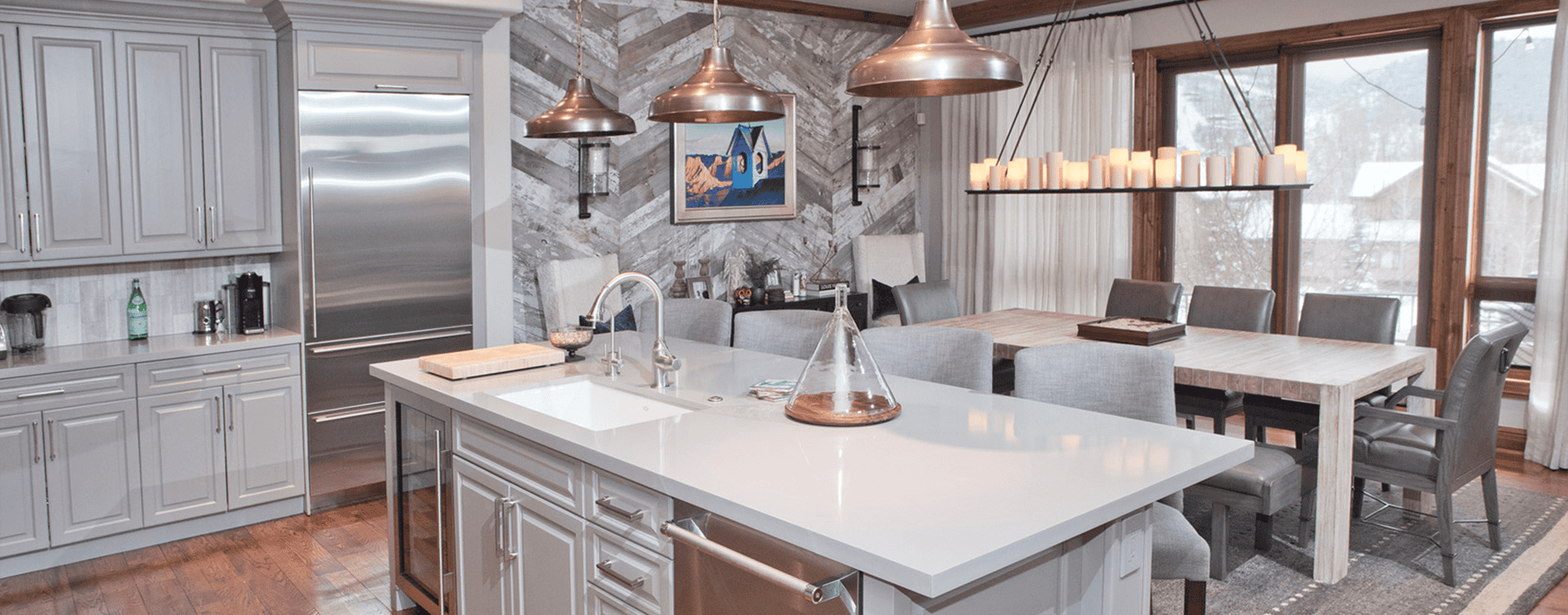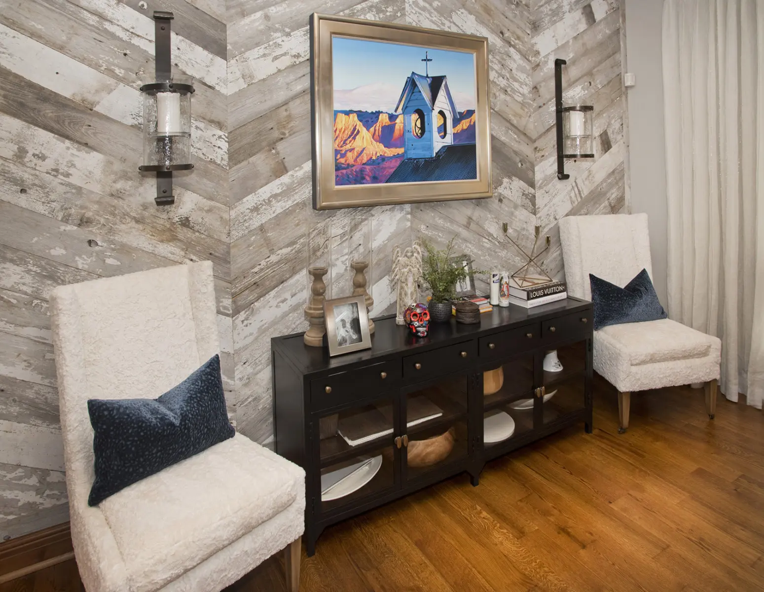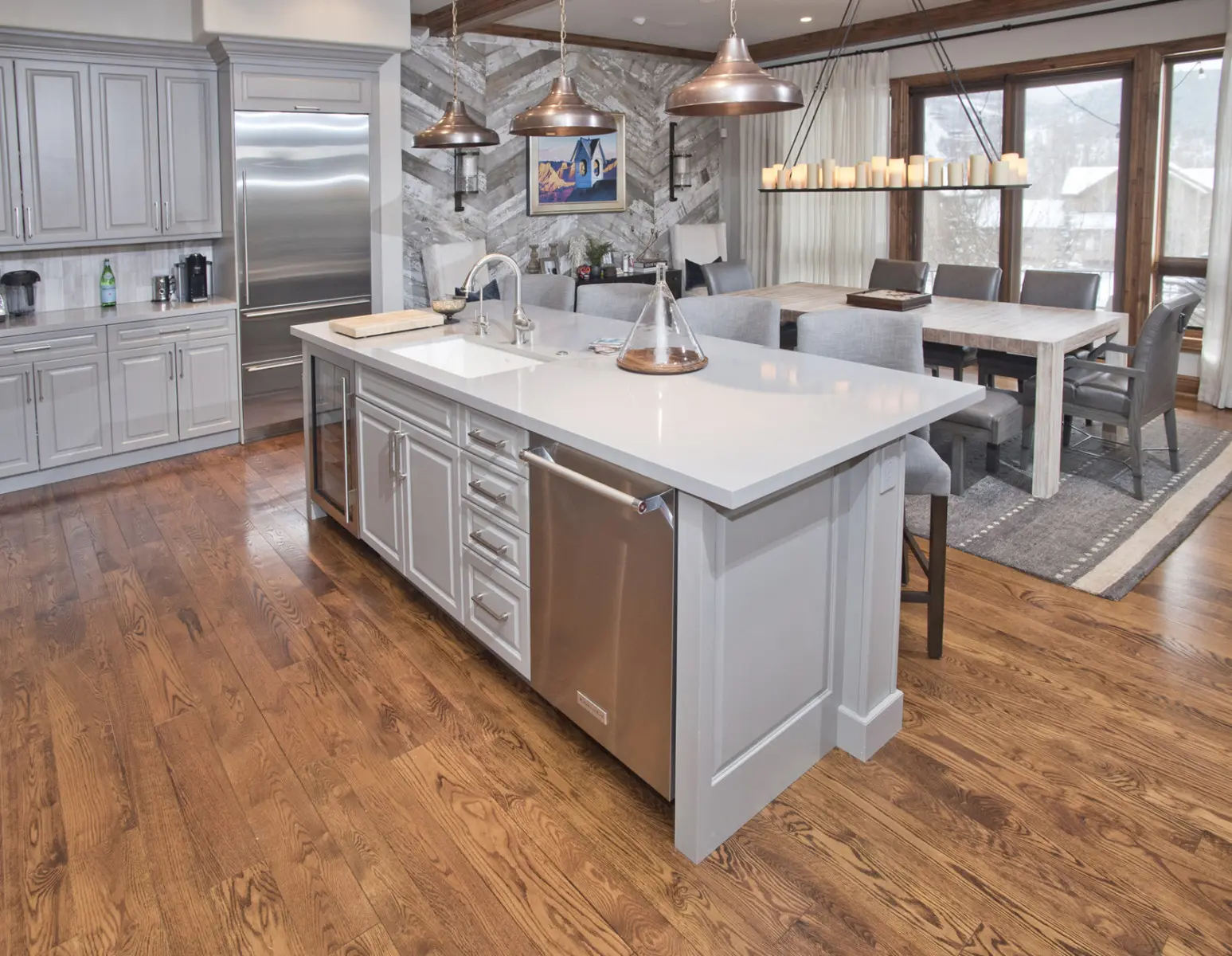 The homeowners found themselves with a small issue. This one wall in their home in Edwards, Colorado was a hard-to-decorate wall. Creative Floors worked with Their Designer to create a wall that became the main focal point of the home. White Reclaimed White Barn Board with a Chevron installation. This added everything needed to a wall that was in an odd location